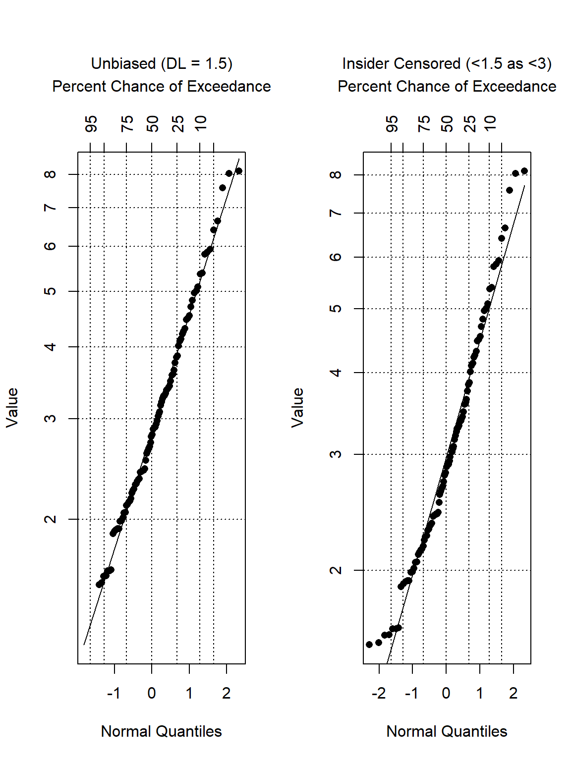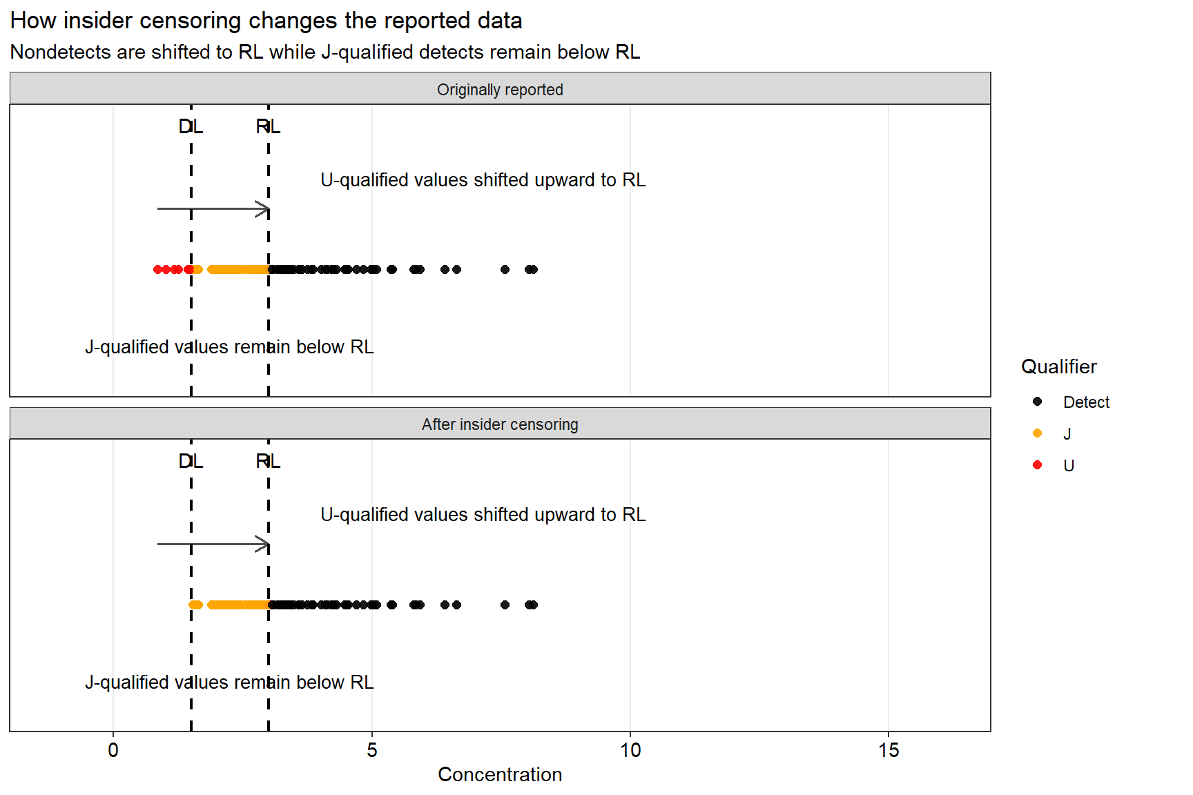 The plot below shows how insider censoring changes the data. Values below the DL are shifted upward to the RL, but J-qualified values remain below that same RL. This creates a lower tail that is no longer internally consistent.