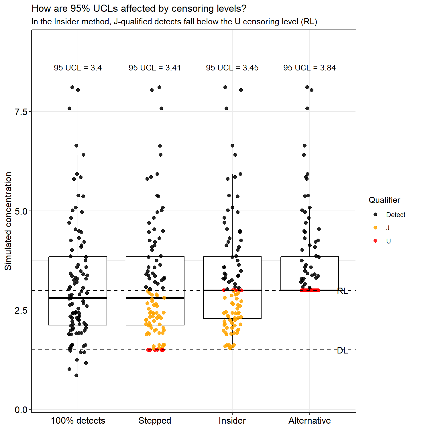 In this simulation, 100 lognormal concentrations with a lognormal mean of 1 and a standard deviation of 0.5 are generated. The DL and RL are chosen to make the censoring patterns easy to visualize. The underlying data are then represented in four different ways. The first treats all observations as detected values. The second uses a stepped approach, where U-qualified results are censored at the DL and J-qualified values remain between the DL and RL. The third applies insider censoring, in which U-qualified results are censored at the RL while J-qualified values are still reported below it. The fourth shows an alternative approach that assigns the RL to both U- and J-qualified values that fall below the RL.